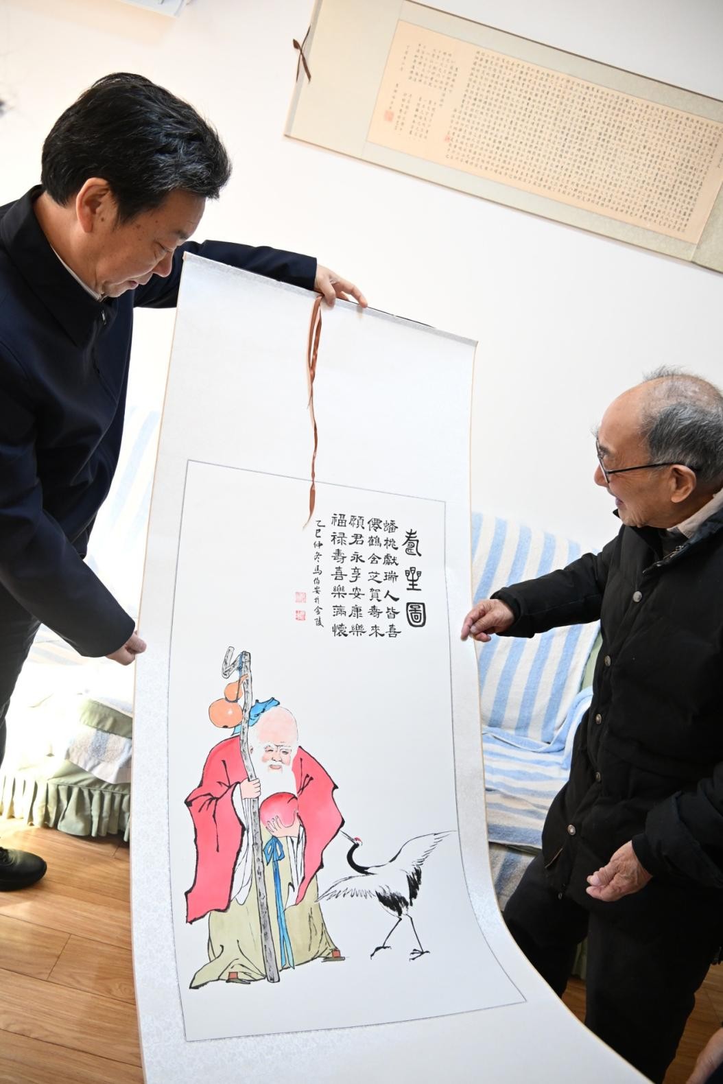 (程老认真欣赏省统计局退休干部所作的《寿星图》)